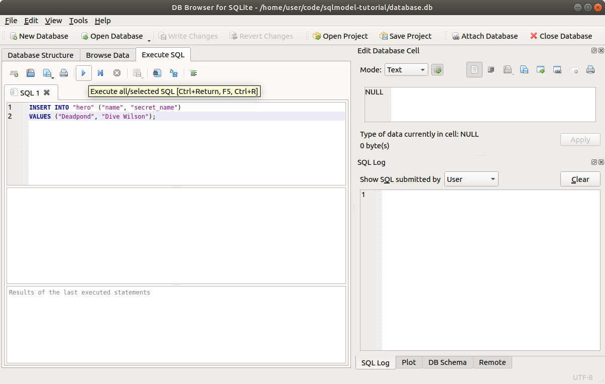If you don't have that database.db file with the table hero, you can re-create it by running the Python program at the top. 👆